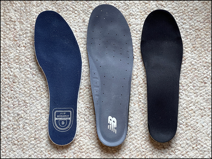 The second photo below shows the insoles of these two shoes which I took out of the sneakers for this photo, and it demonstrates the difference more dramatically. My old athletic insole is on the left, in the middle is the insole from the new natural shape shoe, and finally on the right is a custom orthotic molded from my foot. Is your foot shaped like the insole on the far left or the one in the middle? My guess is the one in the middle. You can see that the natural shape insole and the custom orthotic are the same straight ahead shape.