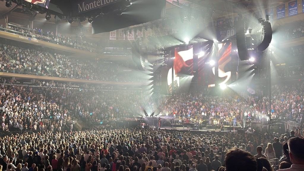 The show was interrupted for a few minutes early on by two players from the New York Rangers hockey team, who joined Billy on stage for a commemorative moment. They made an announcement that it was Billy’s 80th consecutive concert at the Garden, and they raised a banner to the ceiling of the arena to recognize the historic moment. It was neat to see that, and of course the crowd gave the moment a big roar.