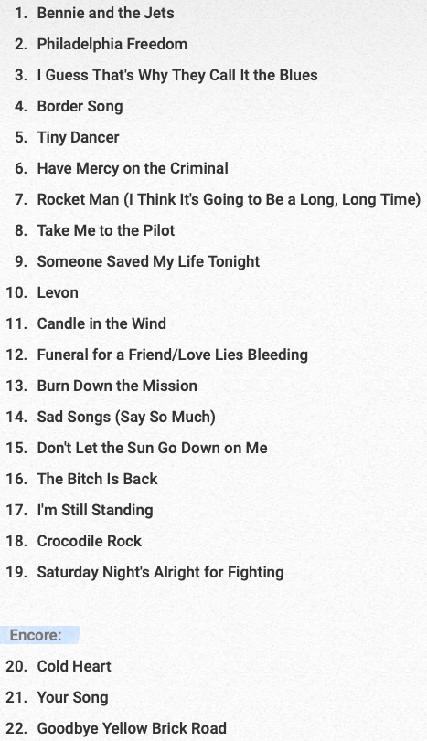 - “Rocket Man” – It was stunning, with a beautiful piano interlude in the middle that had everyone rapt.