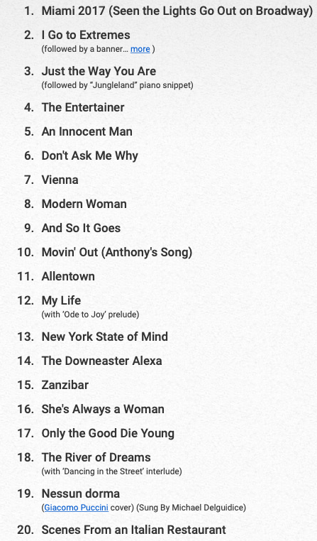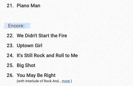 - …and then all of the high octane classic rockers (really, is there ANYONE who doesn’t like these songs?) – “We Didn’t Start the Fire”, “It’s Still Rock and Roll to Me”, “Big Shot”, “You May Be Right”. It doesn’t get much better than this multi-song punch to end a great show.