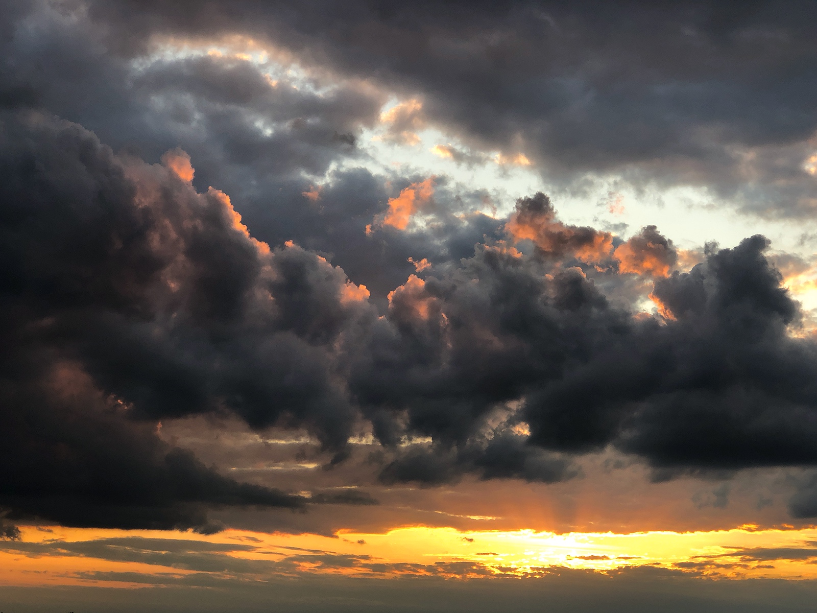 This shot was my favorite of all them. I placed the sun far down in the frame because it’s not the star of the scene, the clouds are. They were low and foreboding in the front with orange-tinged edges, the middle layer was almost colorless and was moving faster than the top and bottom layers, and the top clouds through the gap were normal white and seemingly avoiding the dramatic light below them. I imagined what it would be like to be flying in a plane, swooping in and out of the different layers and colors. Off in the distance, the clouds flattened out and parted to let the sun rays through. Great!
