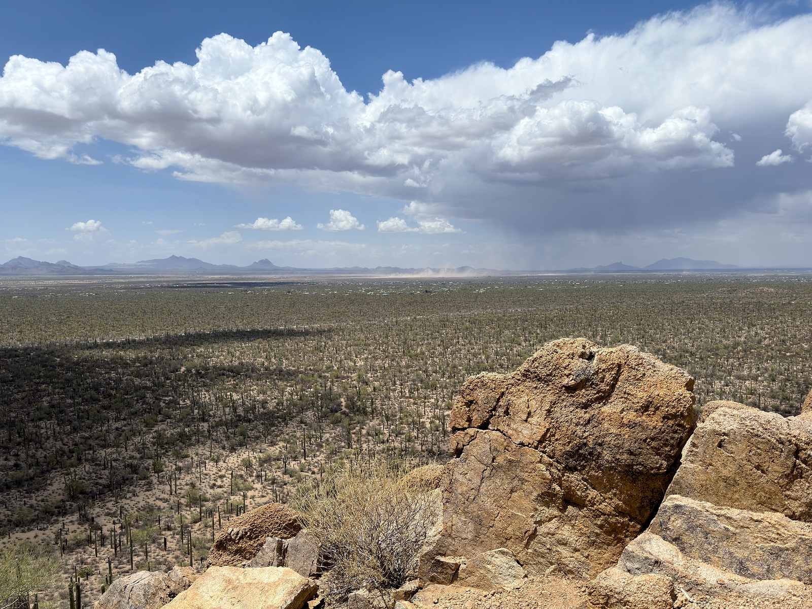 There’s more going on in this photo than immediately meets the eye. The primary thing is the “fight” that’s happening in the center of the photo miles from where I was standing. Look closely and you’ll see a dust storm coming from left-center that’s about to be greeted head-on by a sudden hyper-local rain shower coming from the exact opposite direction. The extreme dryness of the blowing dust meets the drenching wetness of the rain, an example of opposing forces that always coexist in the desert. The otherwise beautiful day all around me ignores the conflict happening between the dust storm and the rain. All the while, none of this made a sound. I took this photo in complete silence except for the sound of the wind and chirping birds. Amen to that.